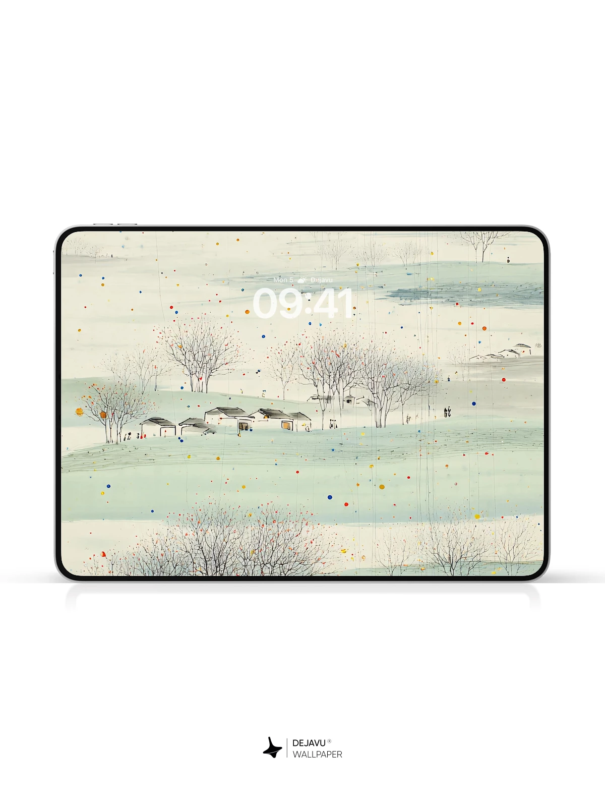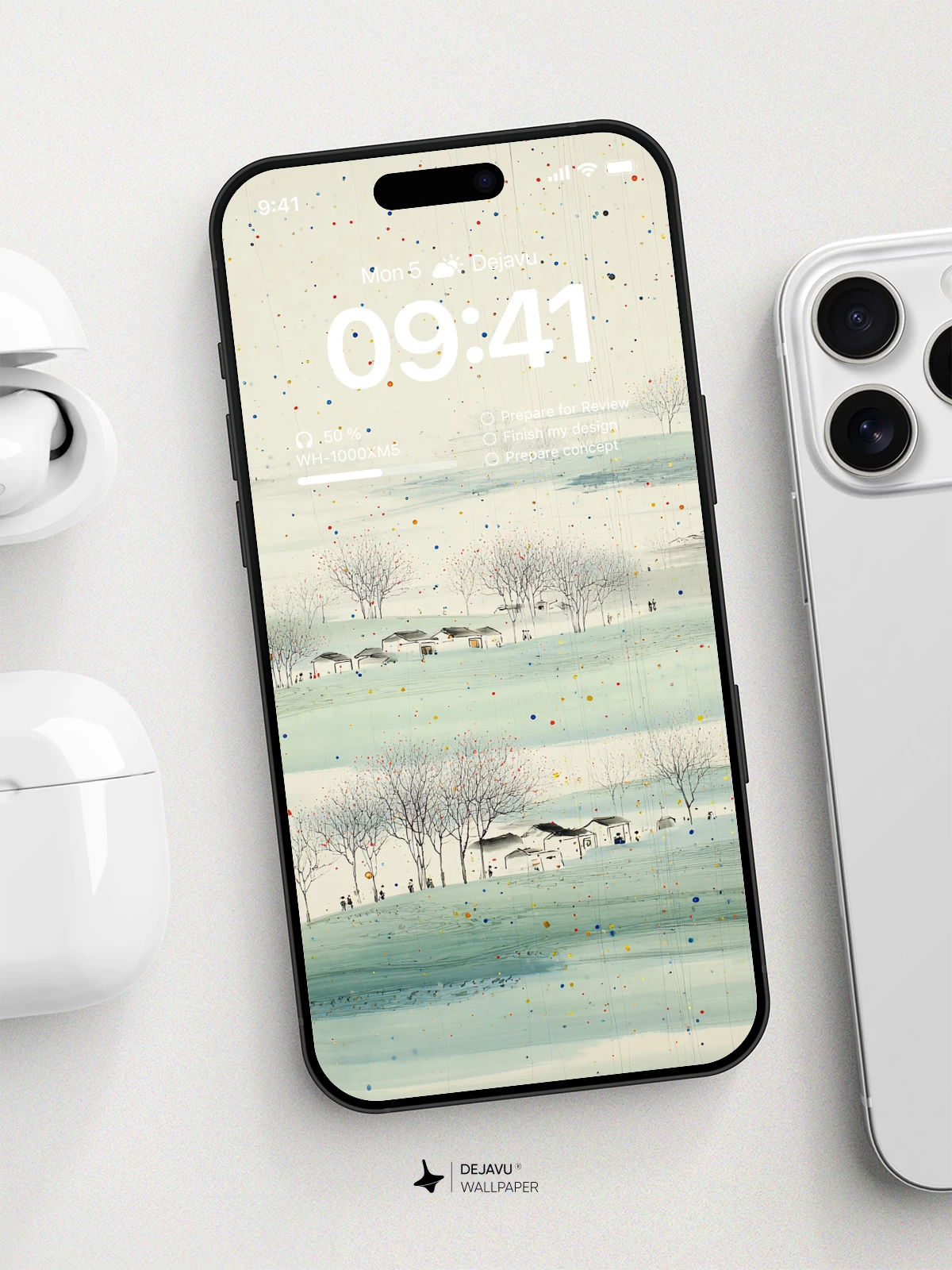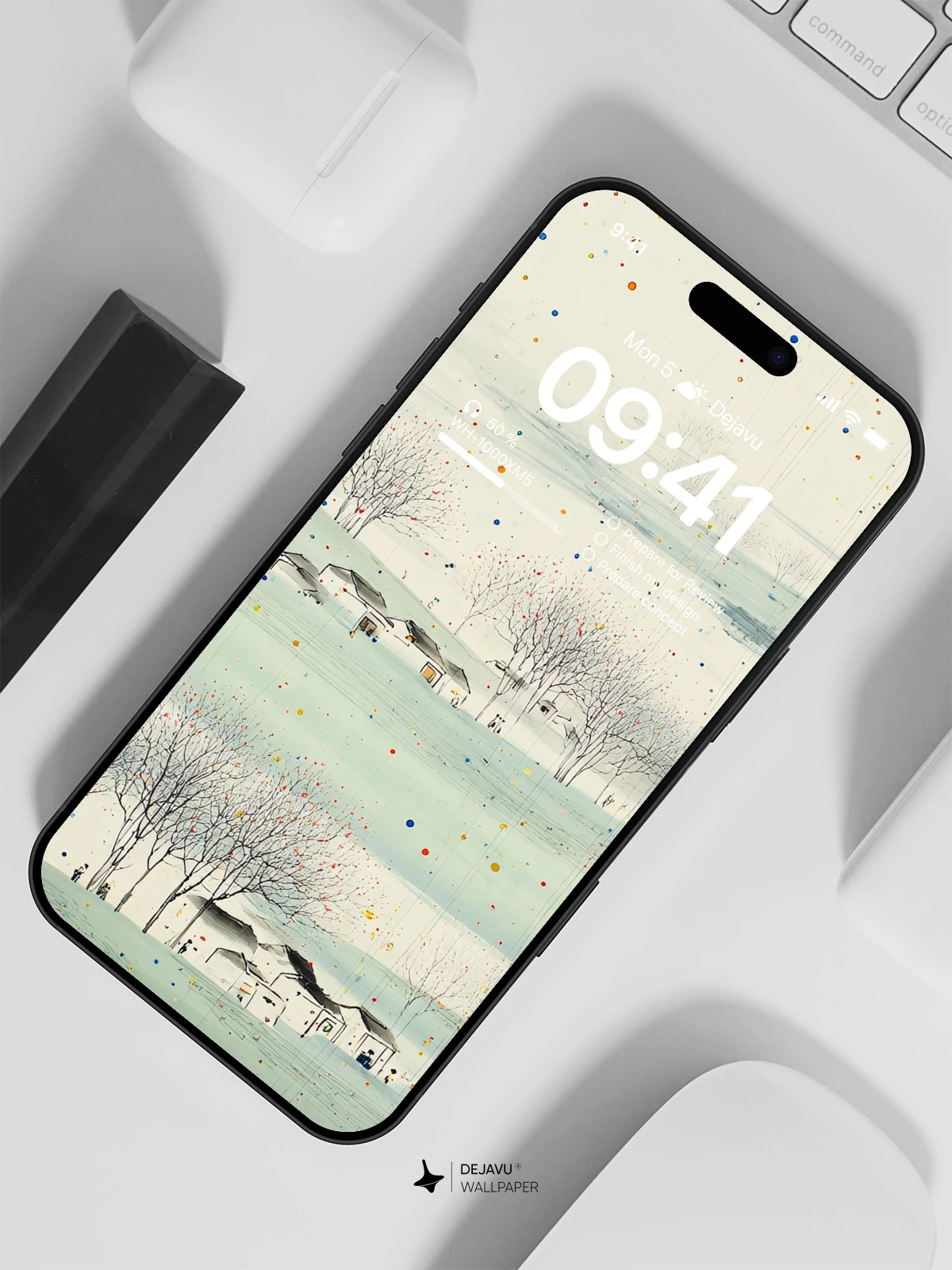 Inspired by the ink wash landscapes of Wu Guanzhong, this design features minimalist trees and houses set against a serene background. The scattered, colorful dots add a whimsical energy. Perfect for iPhone and Android screens.