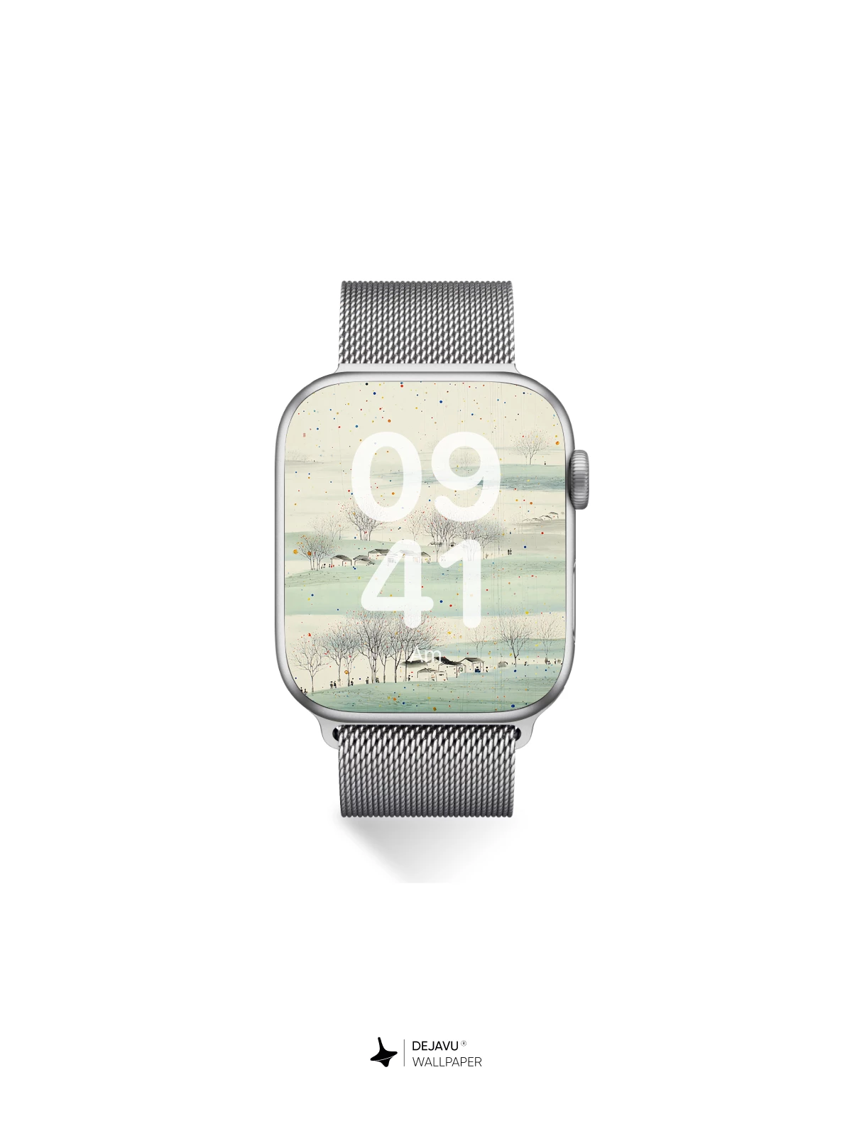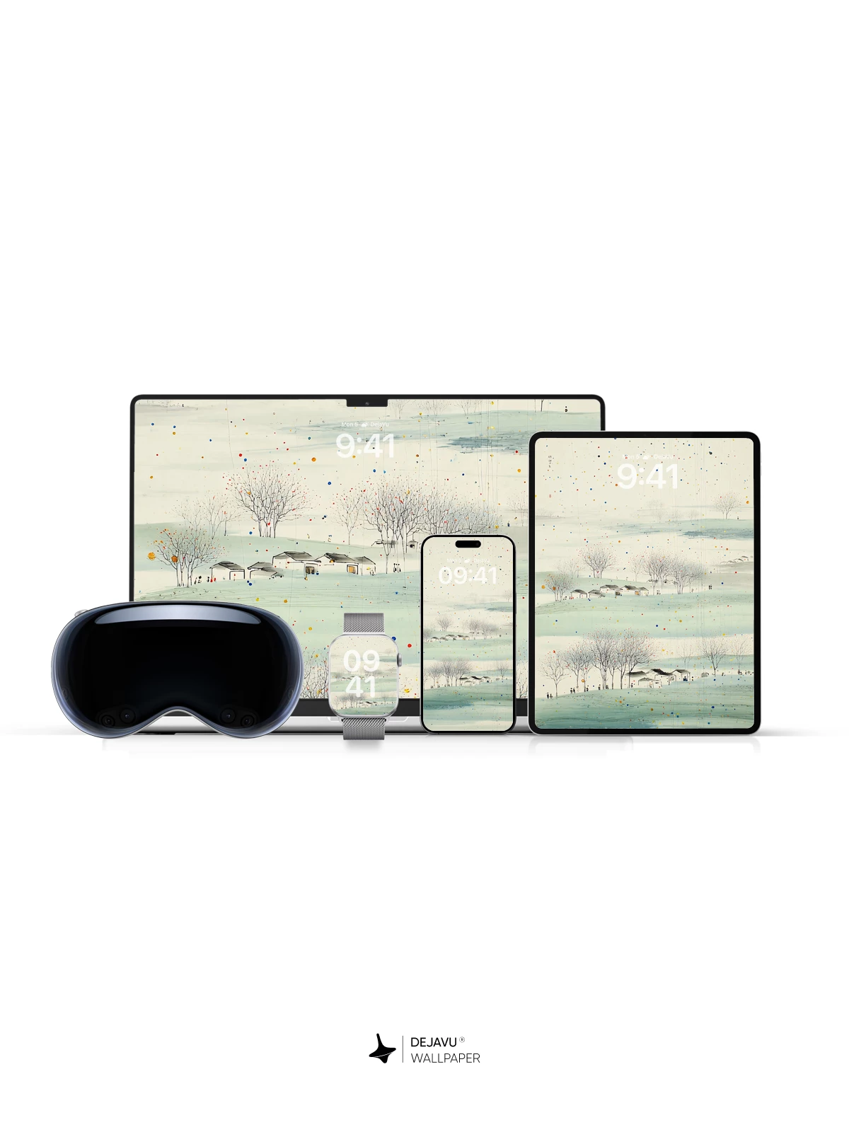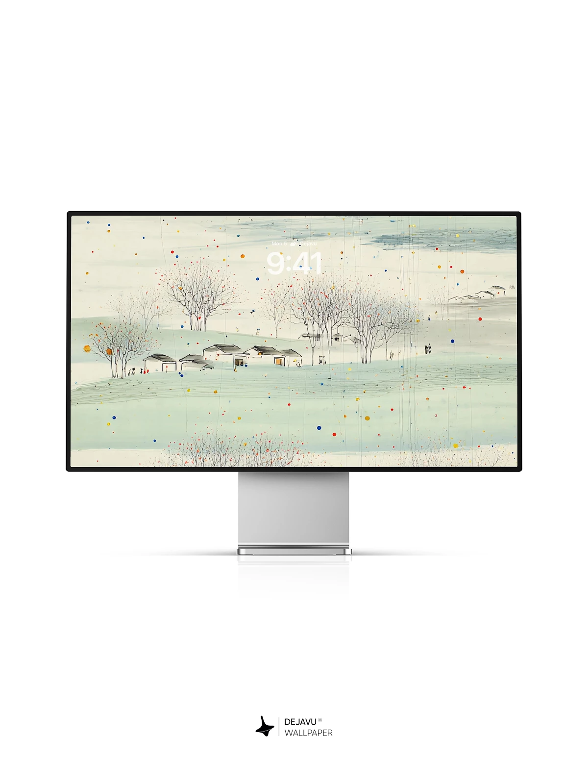 Inspired by the ink wash landscapes of Wu Guanzhong, this design features minimalist trees and houses set against a serene background. The scattered, colorful dots add a whimsical energy. Perfect for iPhone and Android screens.