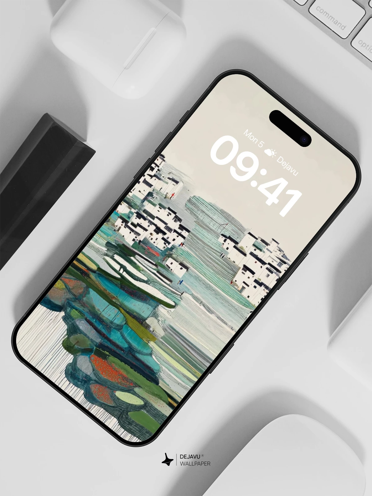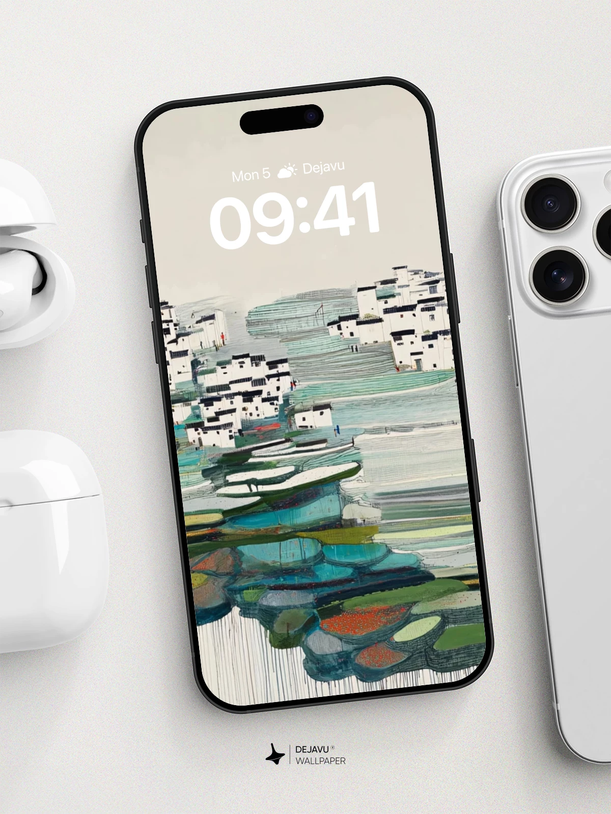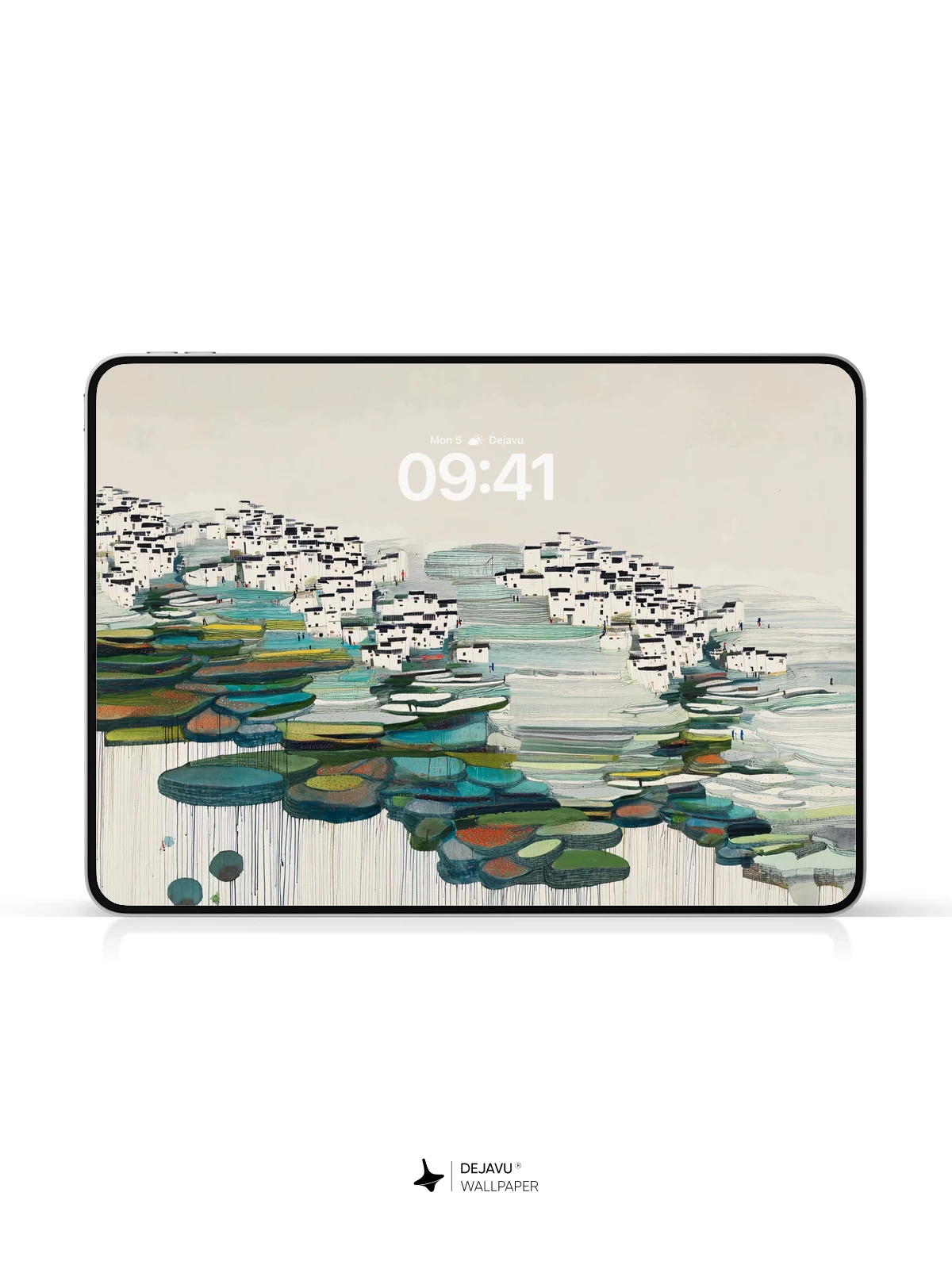 The wallpaper showcases a village with white buildings set against a backdrop of abstract, colorful shapes that evoke the feel of lily pads. The design draws inspiration from Wu Guanzhong’s style, blending traditional and modern elements. It’s perfect for adding a touch of artistic elegance to your iPhone, Android, or tablet screen.
