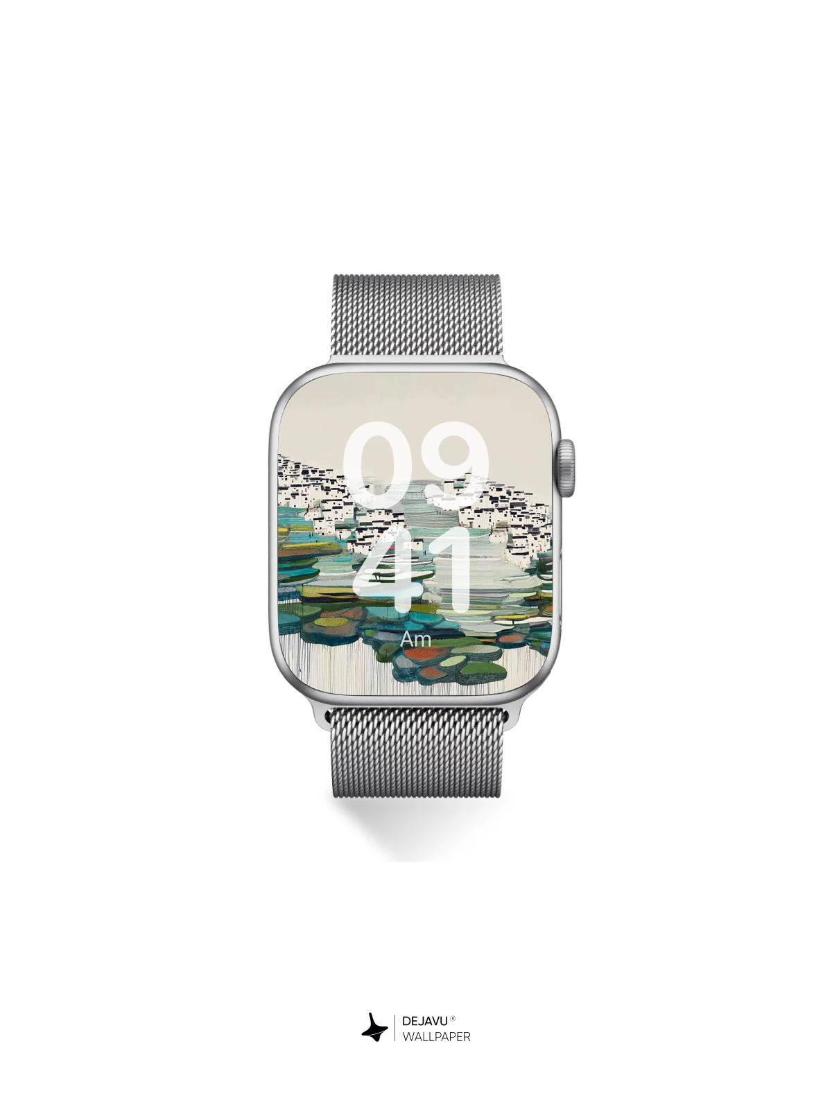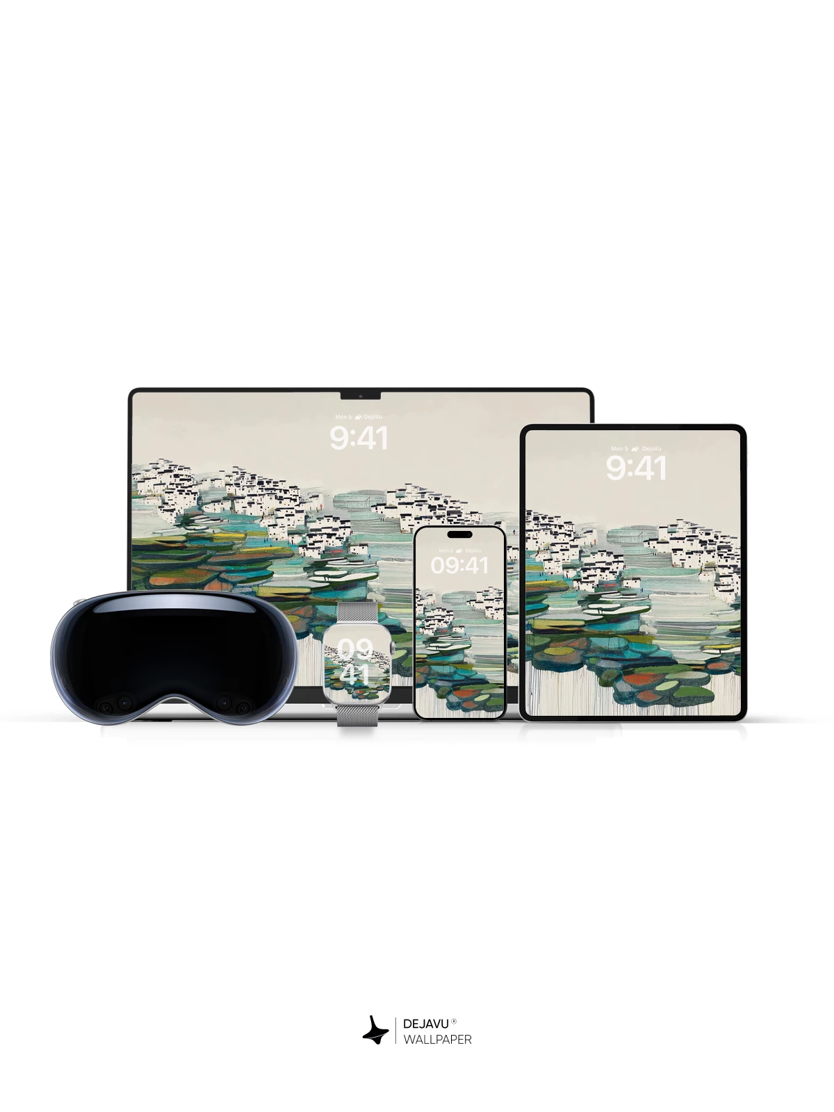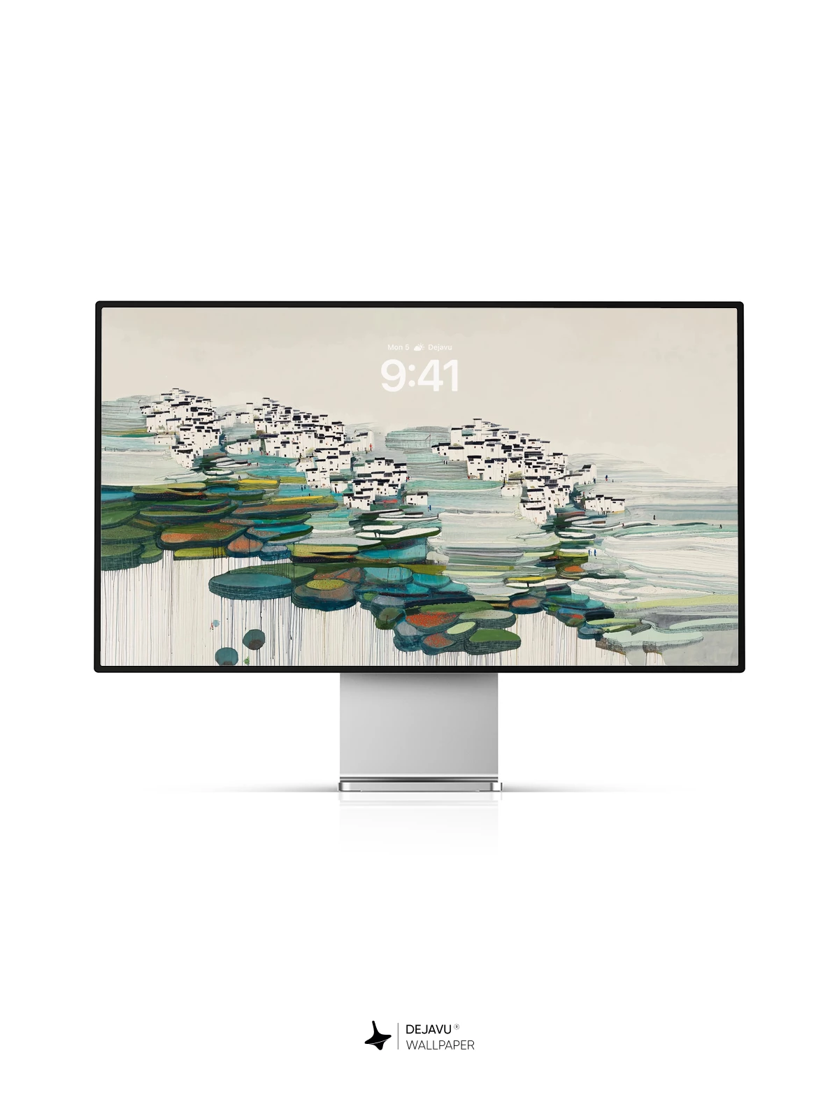 The wallpaper showcases a village with white buildings set against a backdrop of abstract, colorful shapes that evoke the feel of lily pads. The design draws inspiration from Wu Guanzhong’s style, blending traditional and modern elements. It’s perfect for adding a touch of artistic elegance to your iPhone, Android, or tablet screen.
