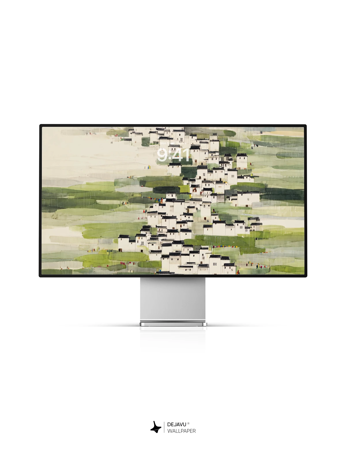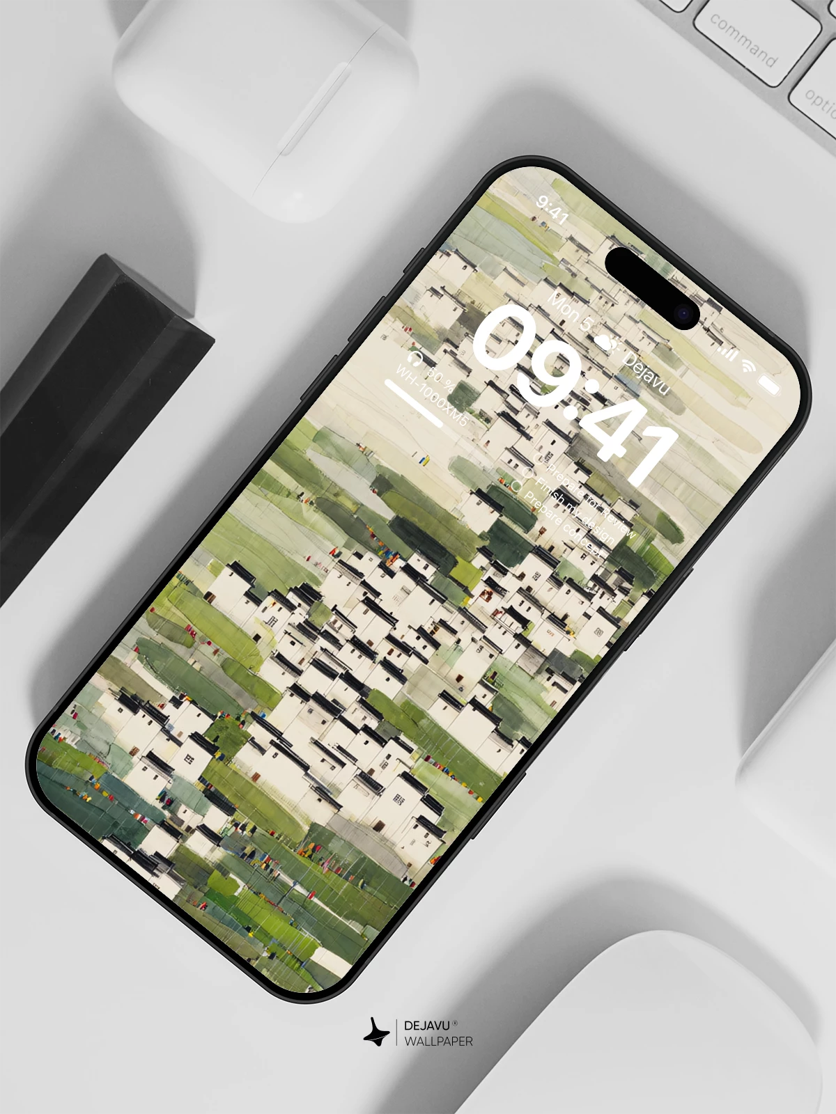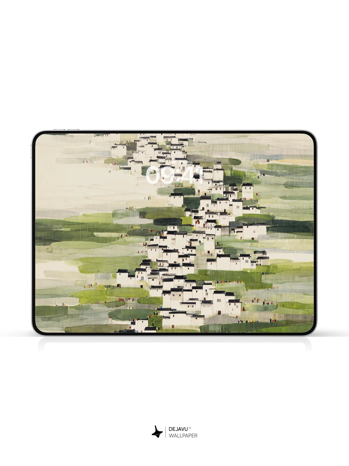 This wallpaper captures the delicate essence of a rural village, with white houses cascading down lush green hills. The misty, watercolor-like texture creates a peaceful, dreamy atmosphere, perfect for iPhone, Android, and tablet screens.