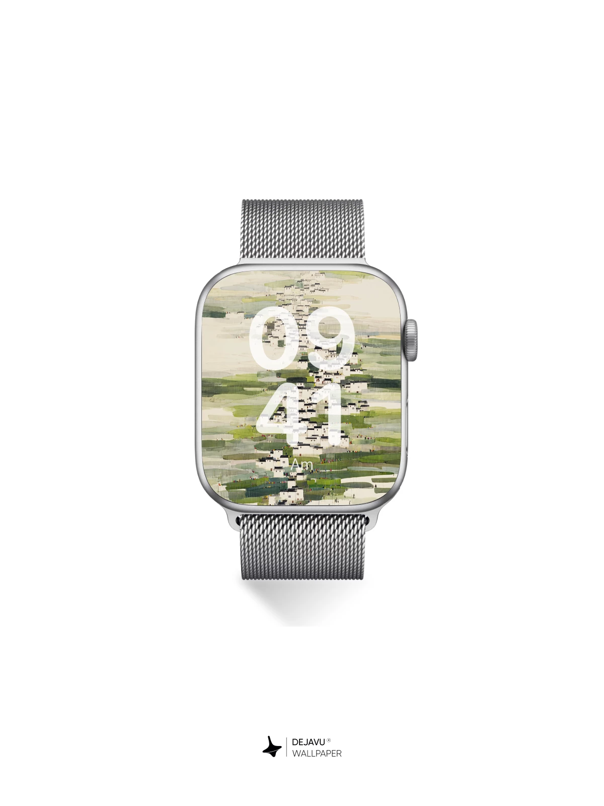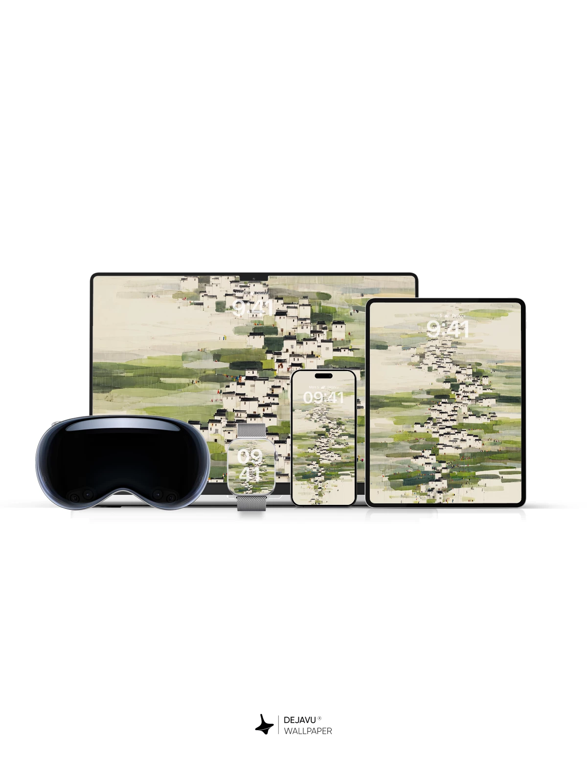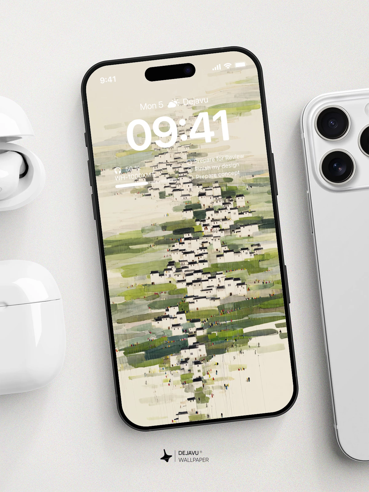 This wallpaper captures the delicate essence of a rural village, with white houses cascading down lush green hills. The misty, watercolor-like texture creates a peaceful, dreamy atmosphere, perfect for iPhone, Android, and tablet screens.