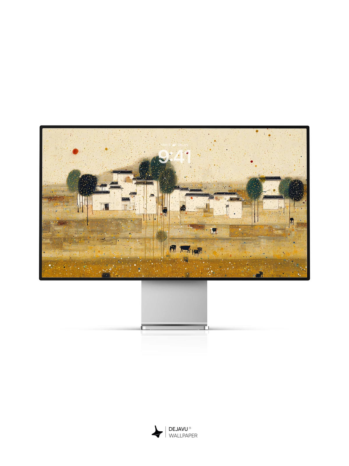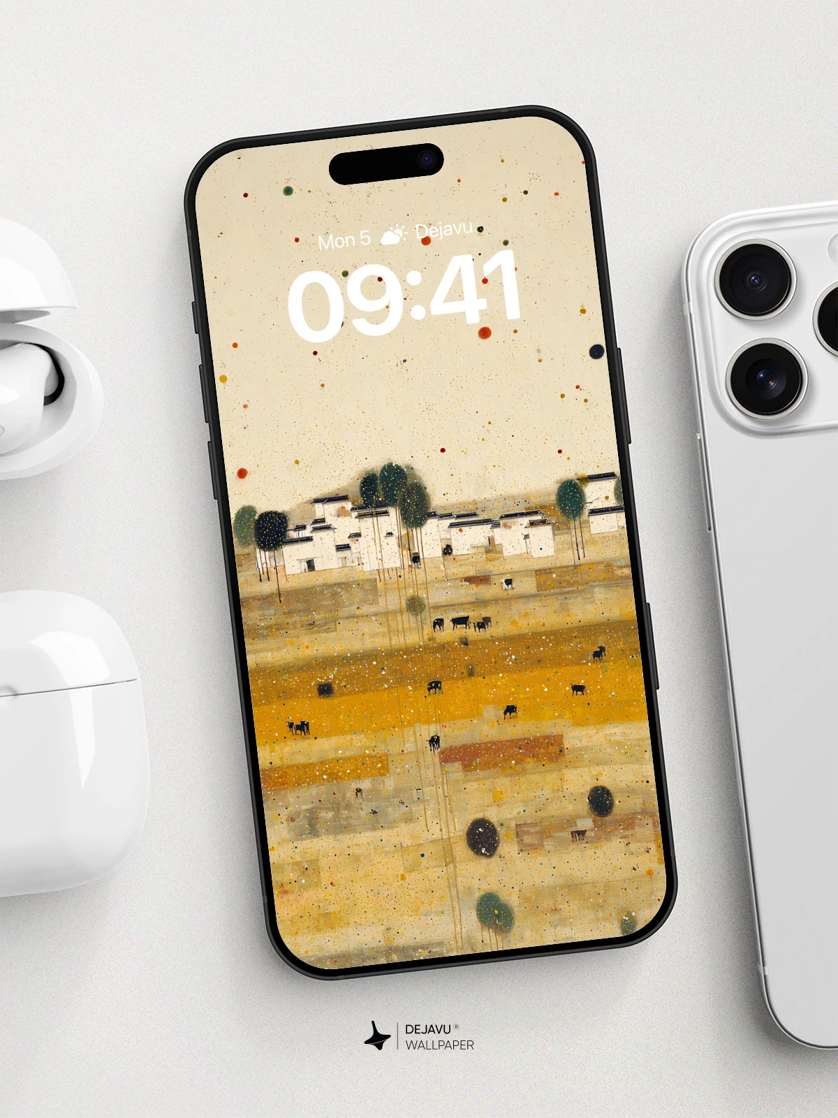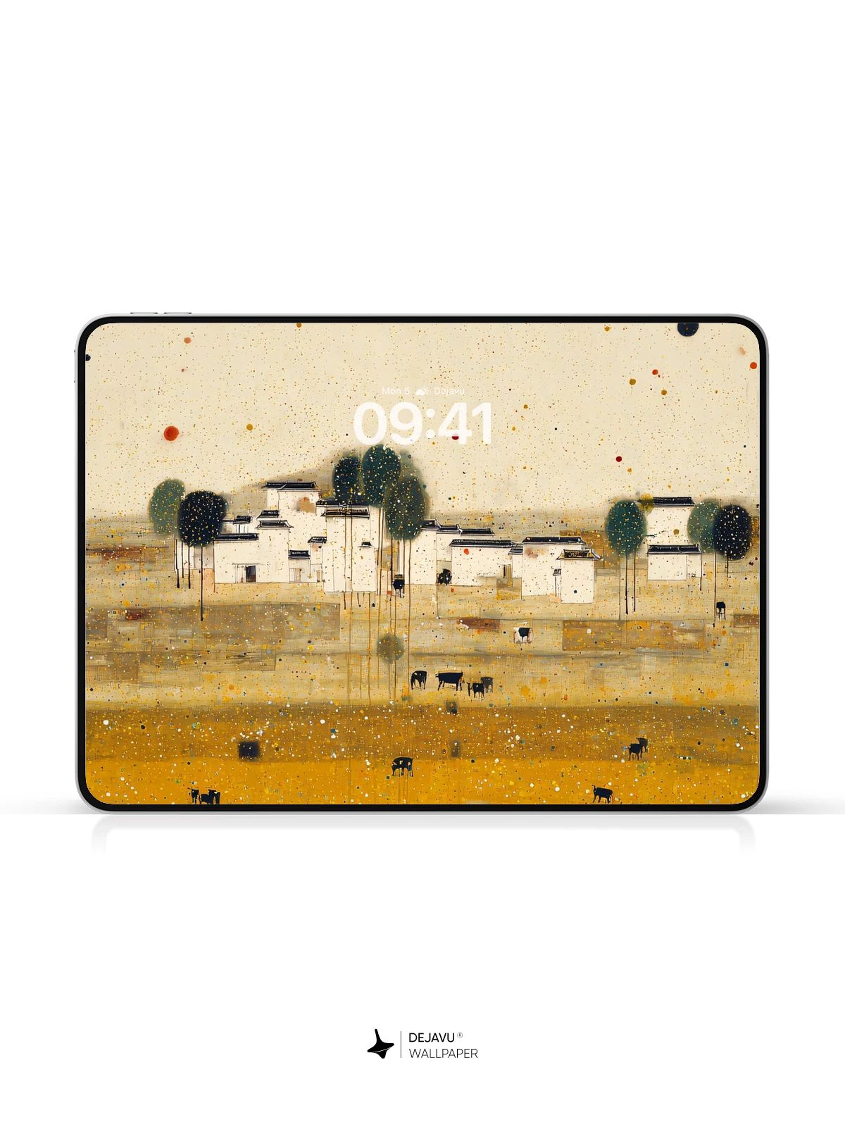 This 8K wallpaper captures the essence of modern Chinese landscape art, echoing the style of Wu Guanzhong. The composition uses a textured, parchment-like base with geometric white houses and stylized dark trees. Scattered color dots add a playful, abstract rhythm to the sky and fields. Perfect for adding a touch of artistic calm to your iPhone, Android, or tablet screen.