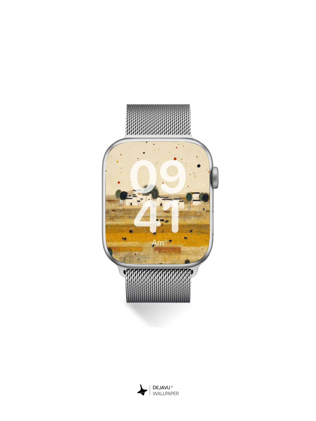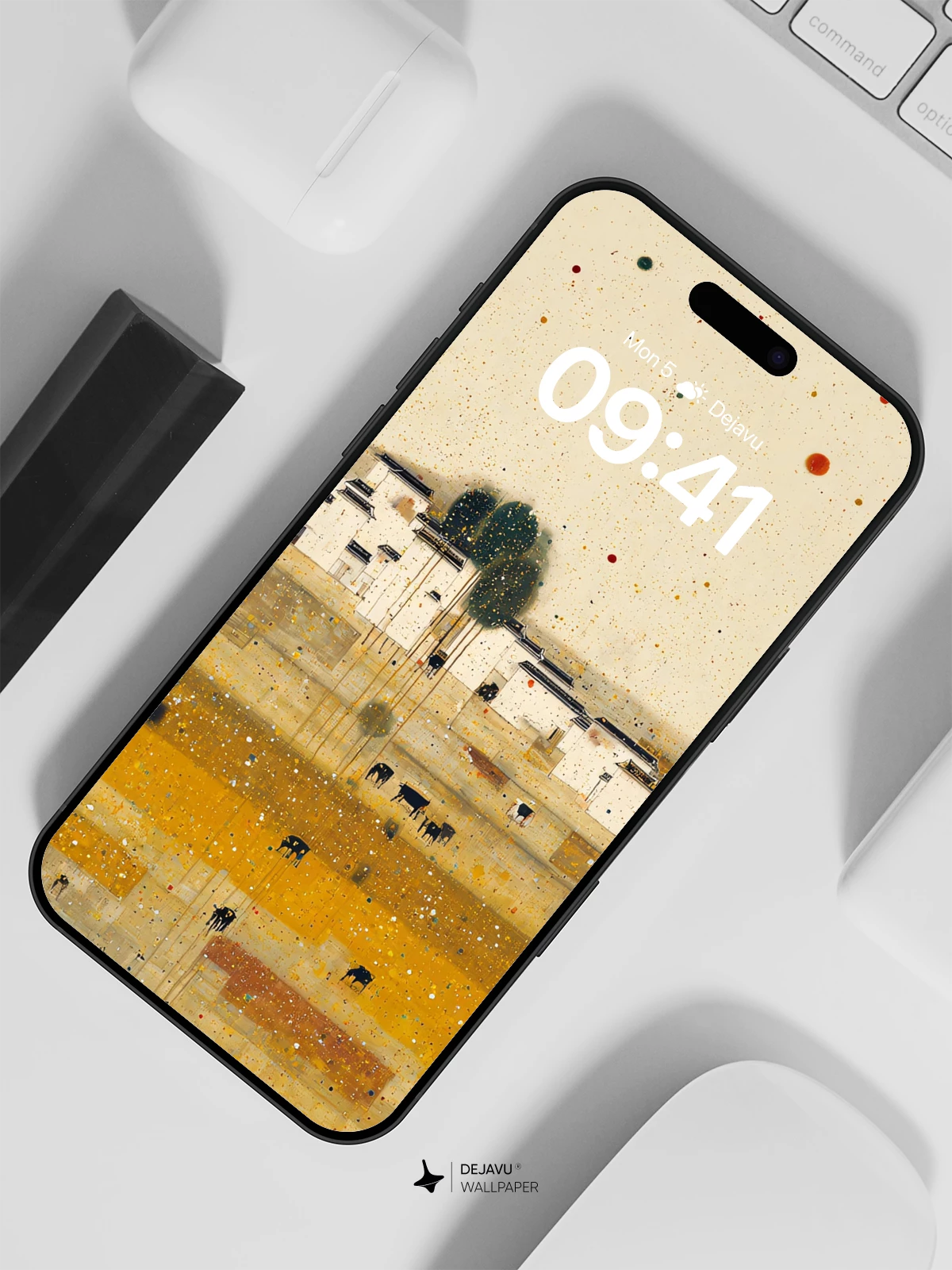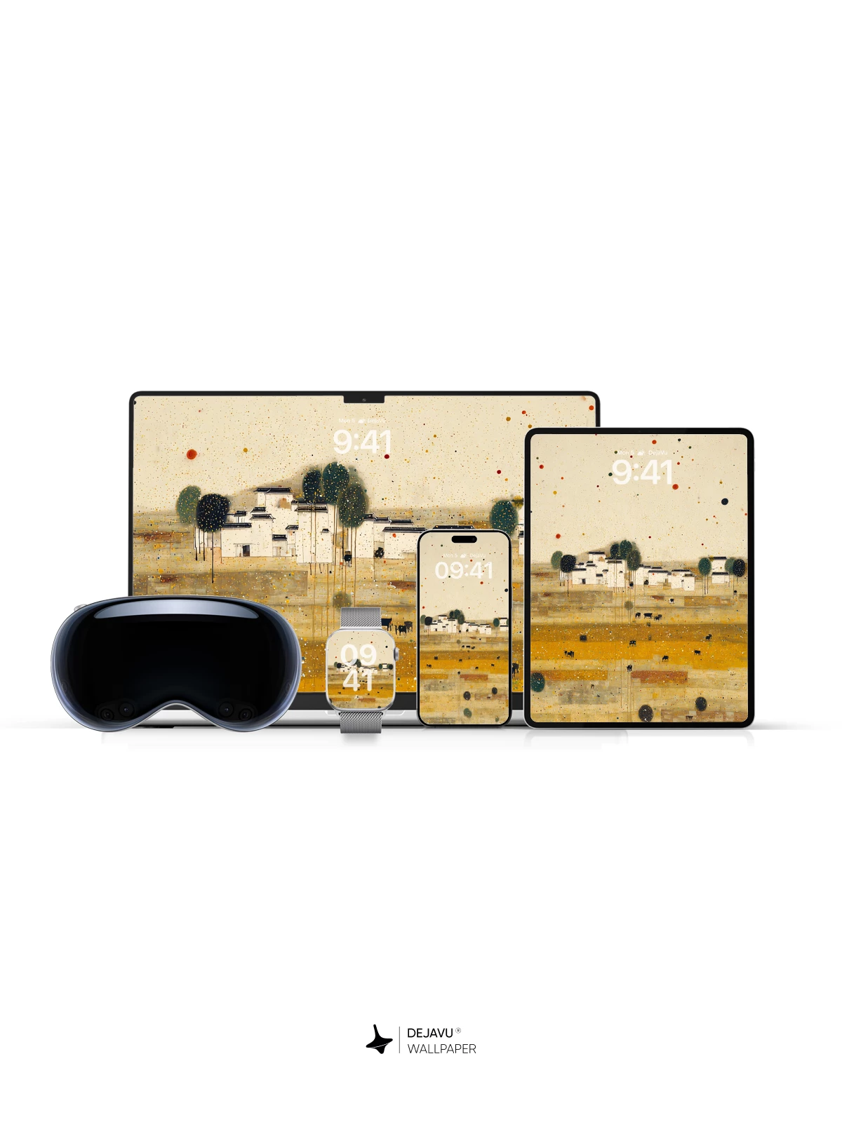 This 8K wallpaper captures the essence of modern Chinese landscape art, echoing the style of Wu Guanzhong. The composition uses a textured, parchment-like base with geometric white houses and stylized dark trees. Scattered color dots add a playful, abstract rhythm to the sky and fields. Perfect for adding a touch of artistic calm to your iPhone, Android, or tablet screen.