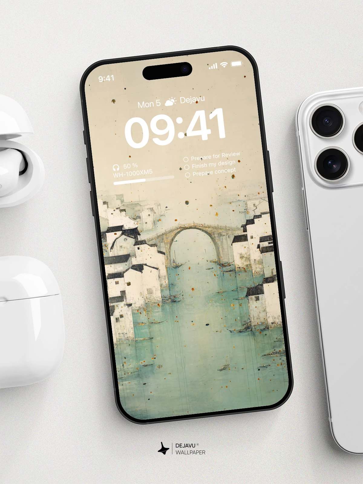 This 8K wallpaper captures a serene water town with white-walled houses, an arched bridge, and tranquil turquoise water, echoing Wu Guanzhong’s style. Ideal for iPhone, Android, and tablets, it adds a touch of minimalist elegance to your device.