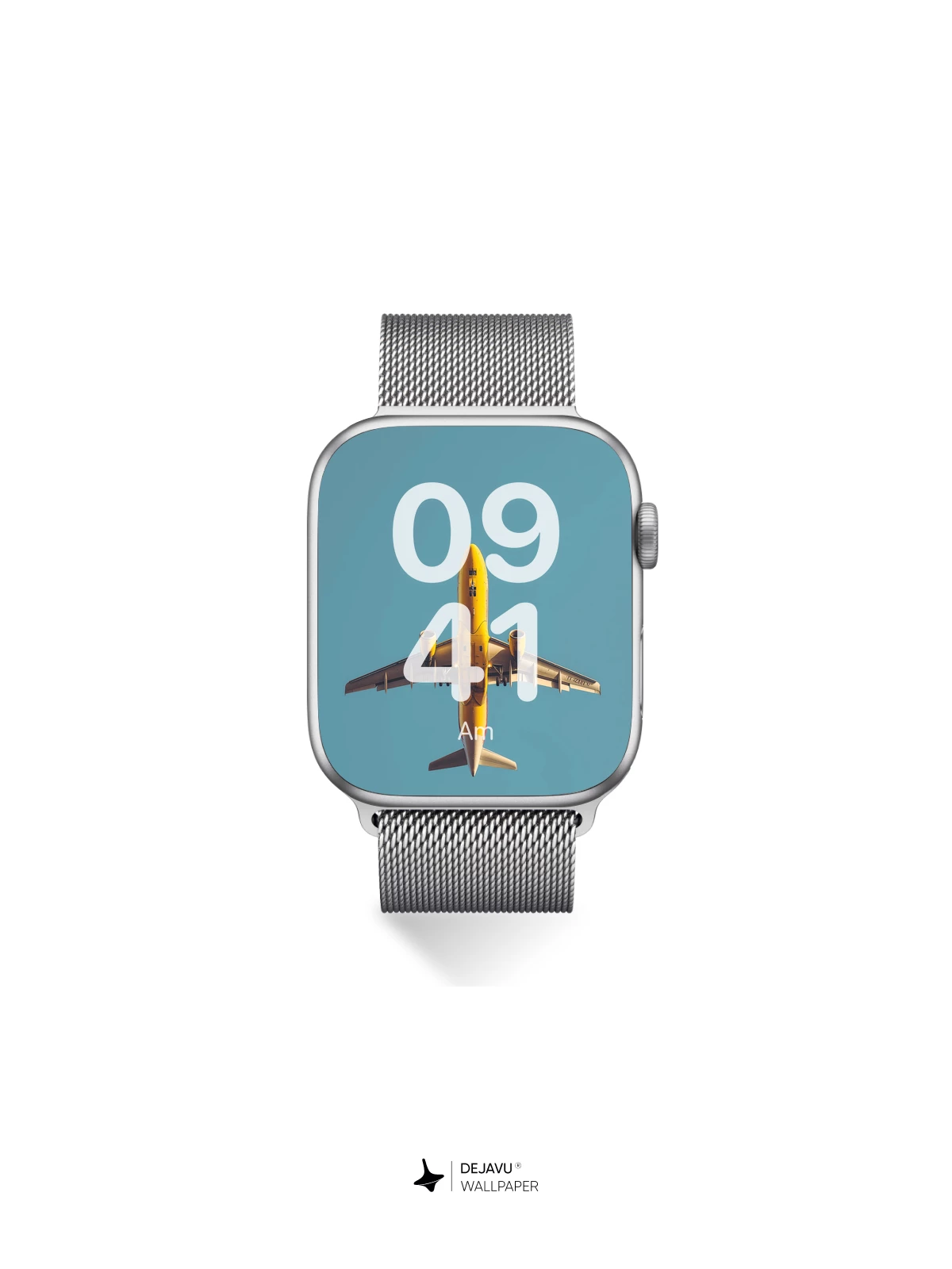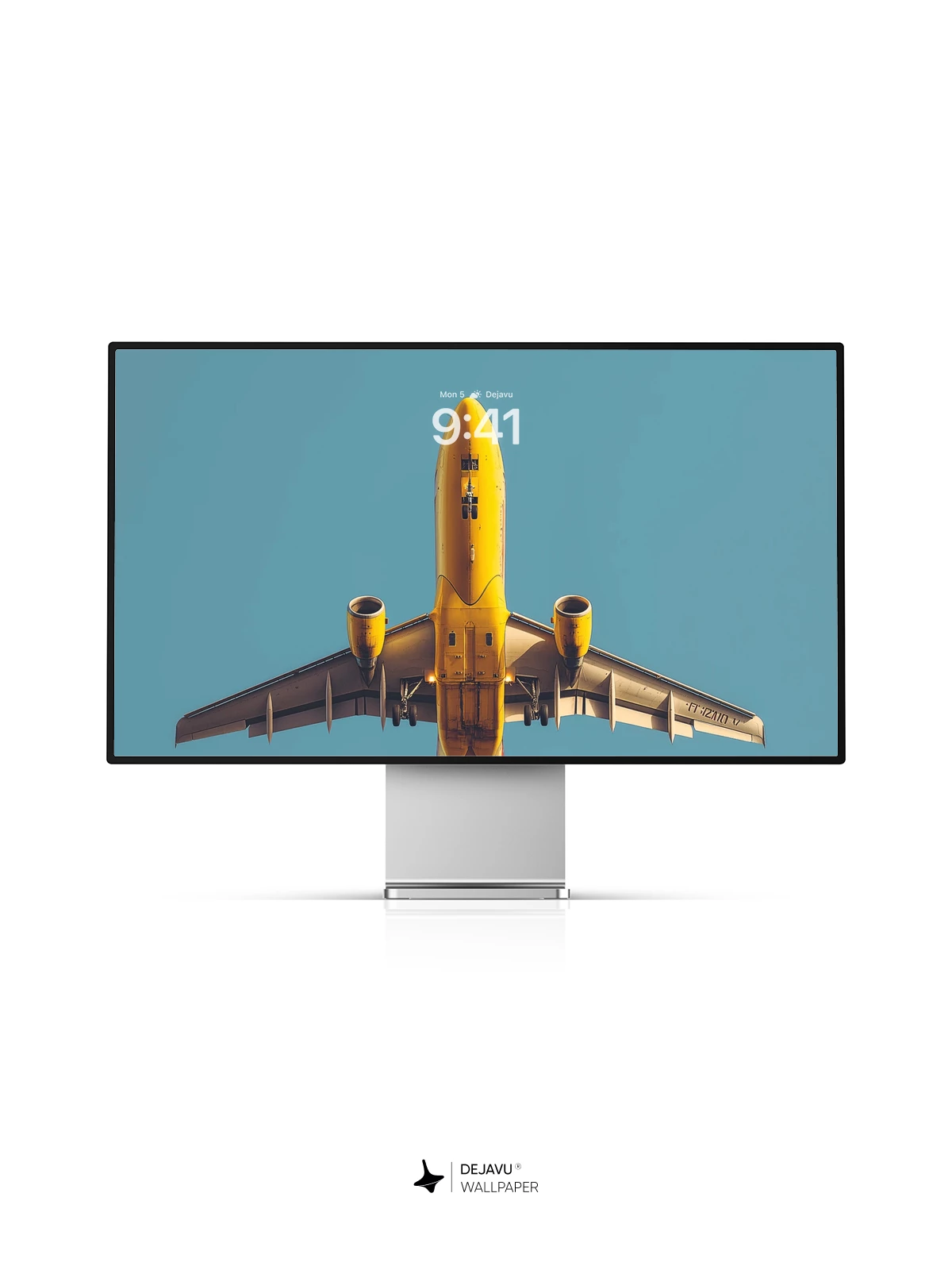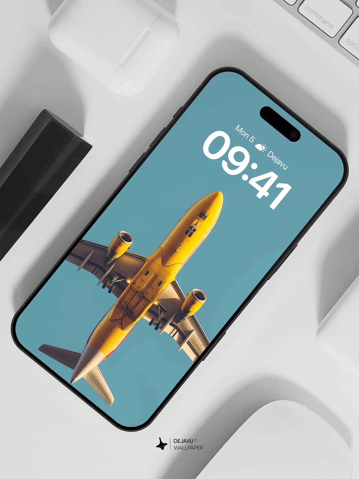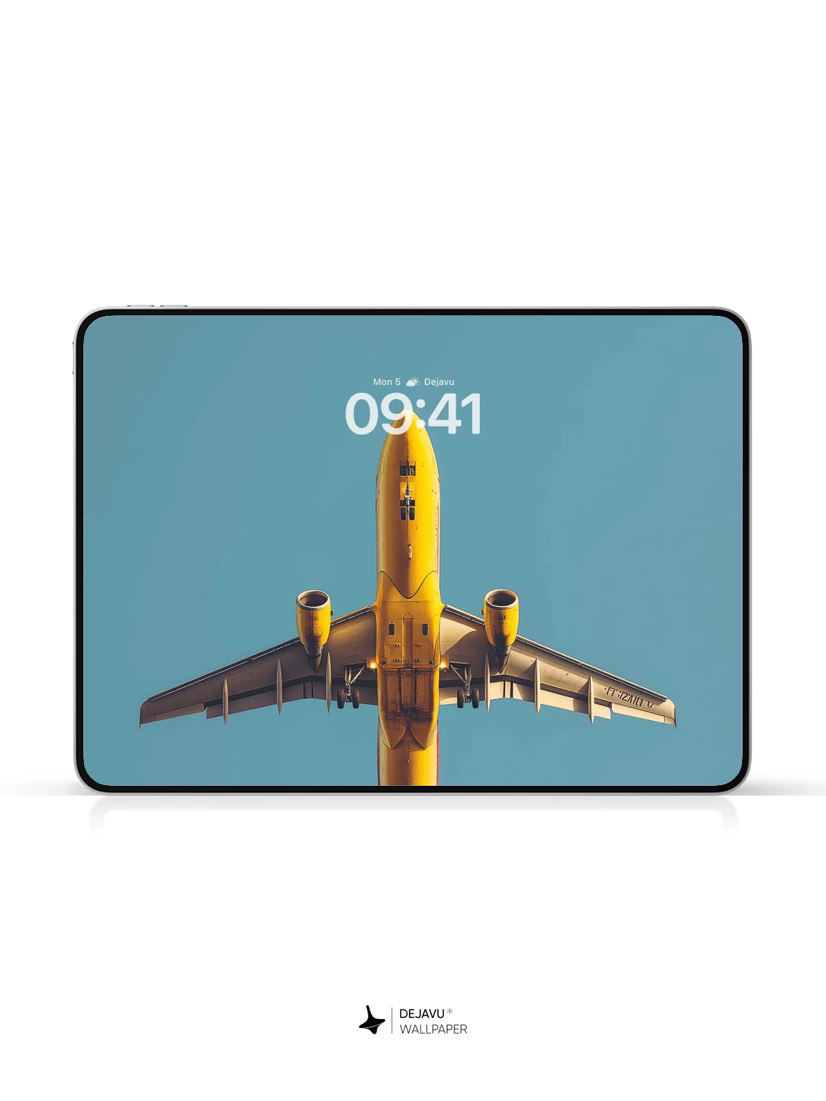 This captivating aerial shot captures a bright yellow commercial jet in mid-flight, viewed from directly below against a serene turquoise sky. The symmetrical design and vivid contrast evoke a sense of freedom and precision, making it an ideal 8K wallpaper for iPhone, Android, or tablets. With its clean lines and dynamic perspective, the image blends aviation elegance with minimalist appeal—perfect for modern digital backgrounds.